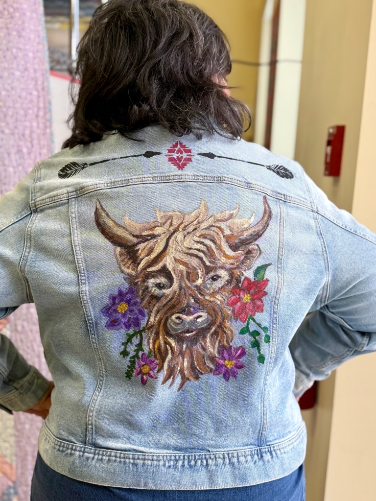 Mona painted a cow on the back of an upcycled denim jacket. To transfer the design outline to her jacket, she used an iron on transfer pencil. Here’s one, available on the Mary Maxim website 🇨🇦